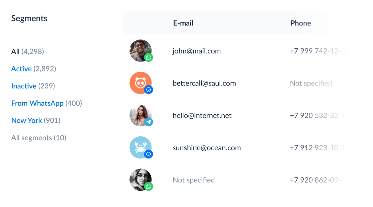Get all messages from online chats, WhatsApp, Telegram, and Viber bots, VK groups in one handy inbox